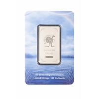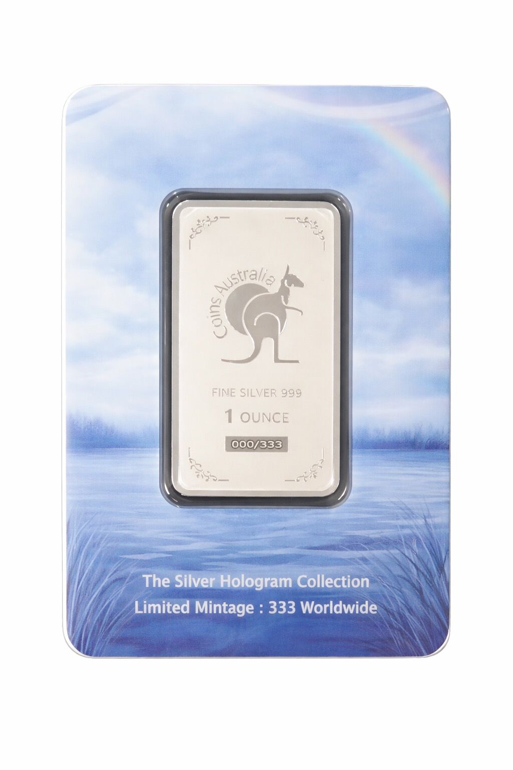 The reverse displays the official Coins Australia branding with a classic kangaroo logo, “FINE SILVER 999”, “1 OUNCE”, and the individual serial number (e.g. 000/333). Each bar is housed in a premium, full-colour illustrated tamper-evident card featuring a serene lakeside scene with rainbow skies, perfectly complementing the holographic design. This is a true collector’s piece that combines exquisite artistry, cutting-edge hologram finishing, and extreme rarity.