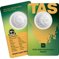 Celebrate the 2026 Hobart ANDA Money Expo with this exclusive Royal Australian Mint show special — the 2026 'TAS' Privy Mark 20c uncirculated coin. Struck especially for the event held on 11–12 April 2026 at Wrest Point Casino, this coin features the official Tasmania privy mark 'TAS' and is only available through ANDA member dealers or by attending the expo live in Hobart.