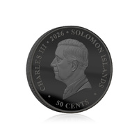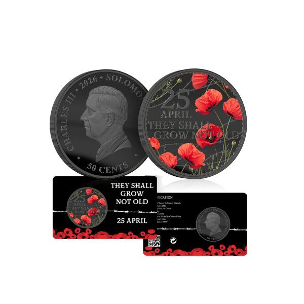 This powerful 2026 ANZAC Day commemorative coin from Solomon Islands honours the enduring spirit of remembrance with the famous line “They Shall Grow Not Old”. Finished in striking black nickel with vivid colour printing, the reverse features bright red poppies against barbed wire, the date “25 APRIL”, and the solemn inscription that has come to define ANZAC Day across Australia and New Zealand. The obverse displays the effigy of King Charles III, confirming its status as official Solomon Islands legal tender with a 50 cents denomination.