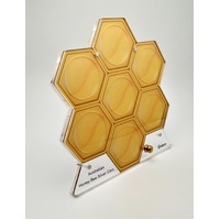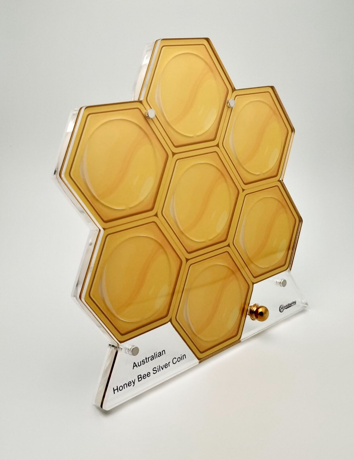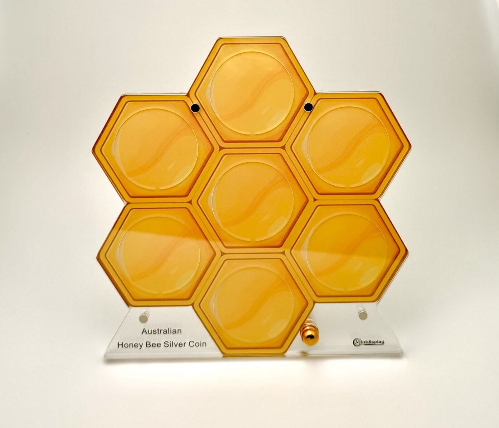 Elevate your Australian Native Bees coin collection with this stunning honeycomb-shaped display stand from MintDisplay, designed specifically for 1oz silver coin series. Crafted from high-quality translucent orange acrylic that mimics the warm glow of fresh honeycomb, the stand features seven hexagonal slots: a central cell for your featured coin and six surrounding ones to showcase the full series. The clear acrylic base includes an engraved label reading “Australian Honey Bee Silver Coin”, adding a professional touch, while a golden knob allows for easy rotation and viewing from all angles.