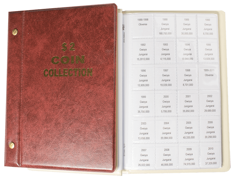 VST $2 Circulating Coin Album to store your complete Two Dollar Aussie Coin Collection. With specially made interleaves with all the circulation Australian $2 Coin Dates, Titles and Mintages described behind each pocket helping you sort your collection.